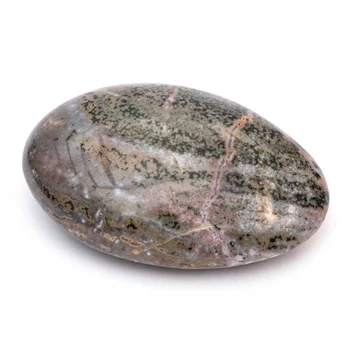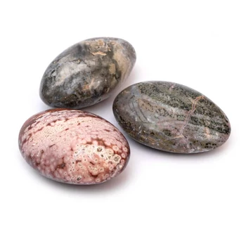 | Tengerpartot idéző mintázatú, kb. 145-165 g súlyú óceánjáspis tenyérkő. A jáspisok gyakori ásványok, melyekben mind az kvarc, mind a kalcedon megtalálhatók. Az óceánjáspis egy tömör, természetes barnás-világos, zöldes színekben pompázó ásvány. | |