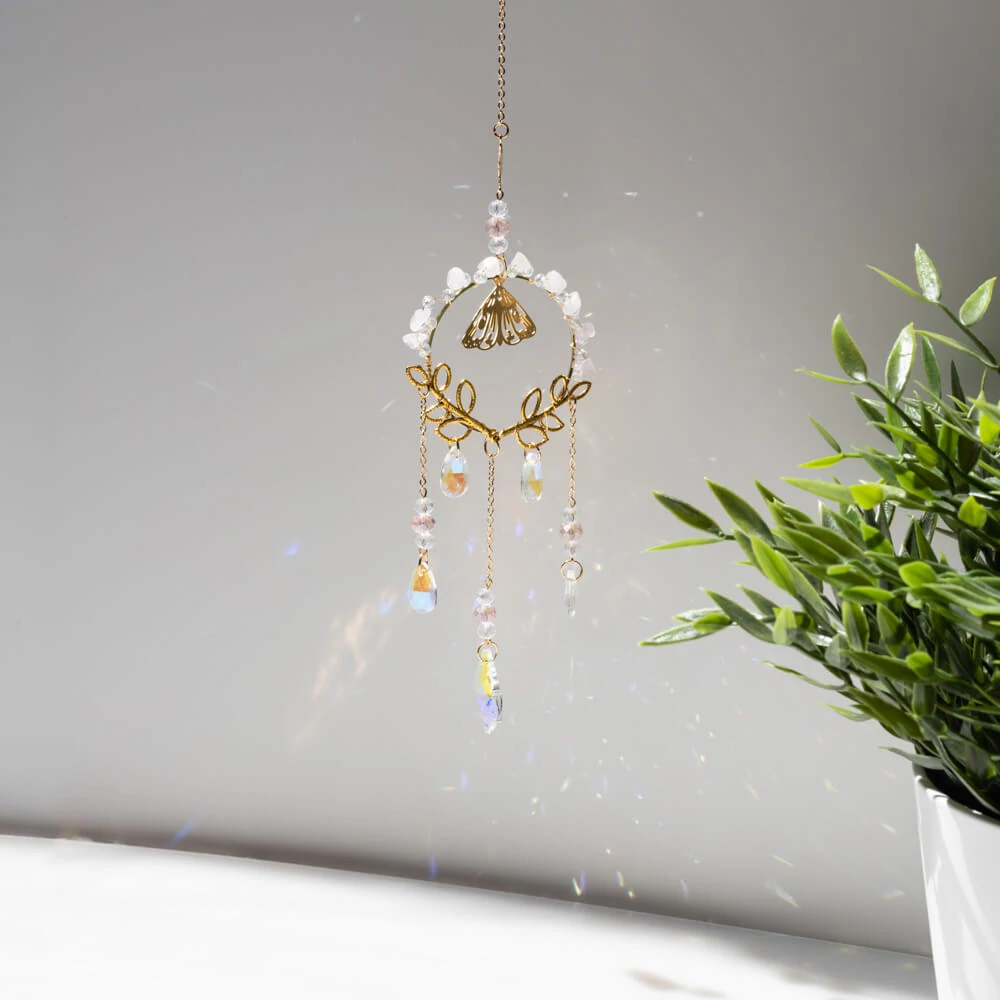 Pillangós napfogó rózsakvarccal díszítve. Egyedi lakásdekor, mely színes fényeket szór, hangulatossá téve otthonod.