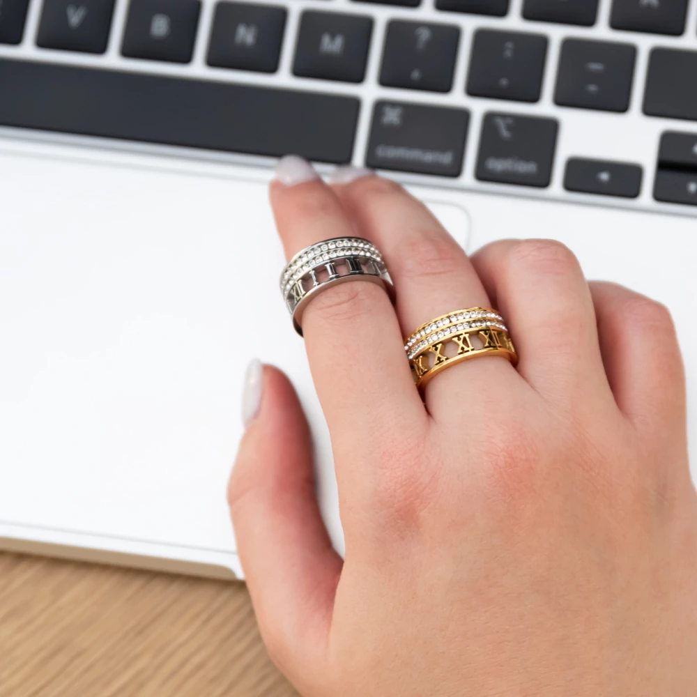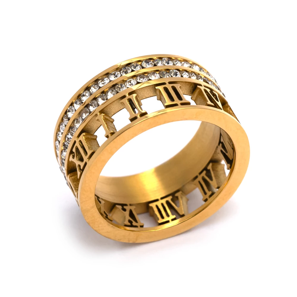 Nemesacél gyűrű, római számos-köves, arany színű, kb. 56-57 méret