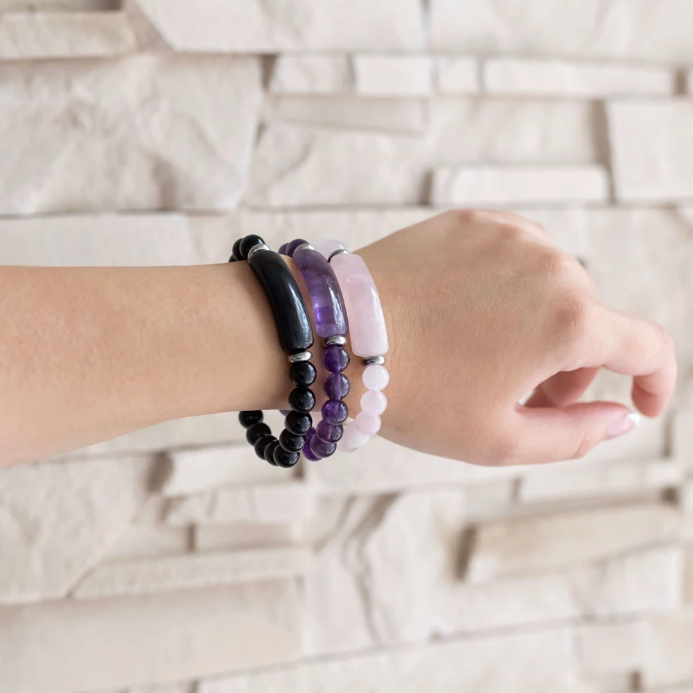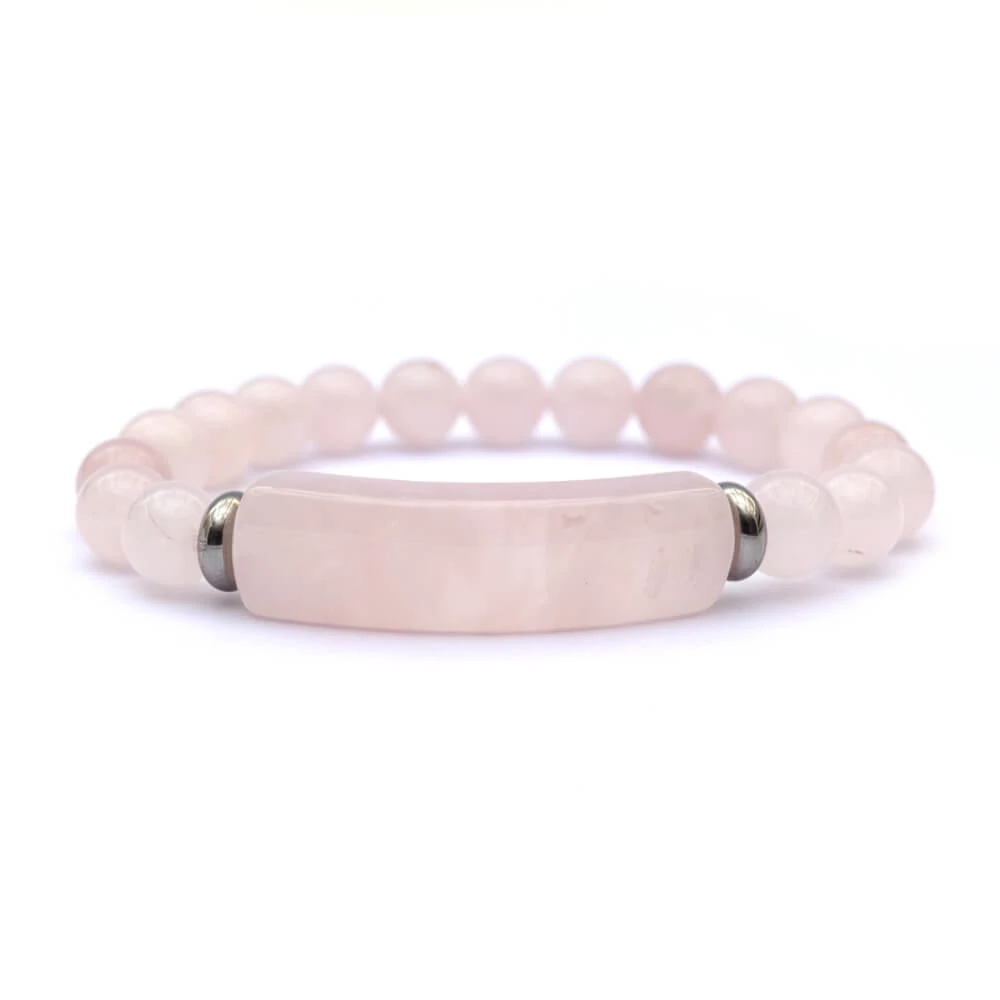 Rózsakvarc téglalap és 8 mm golyós, gumis karkötő, kb. 18-19 cm